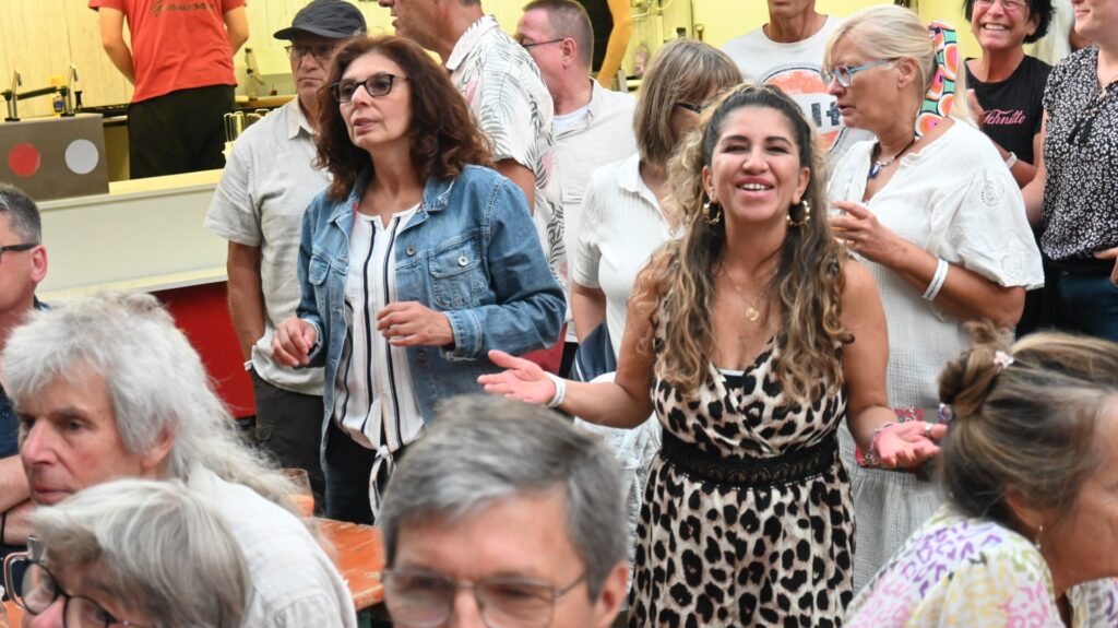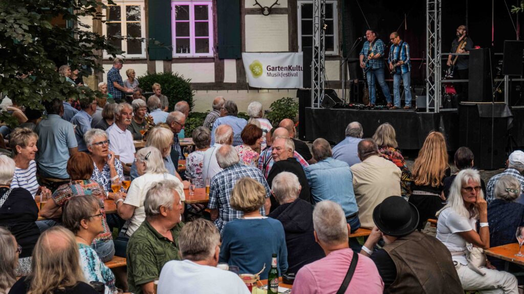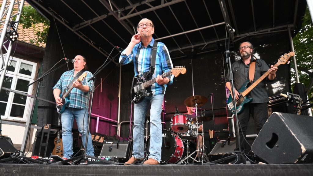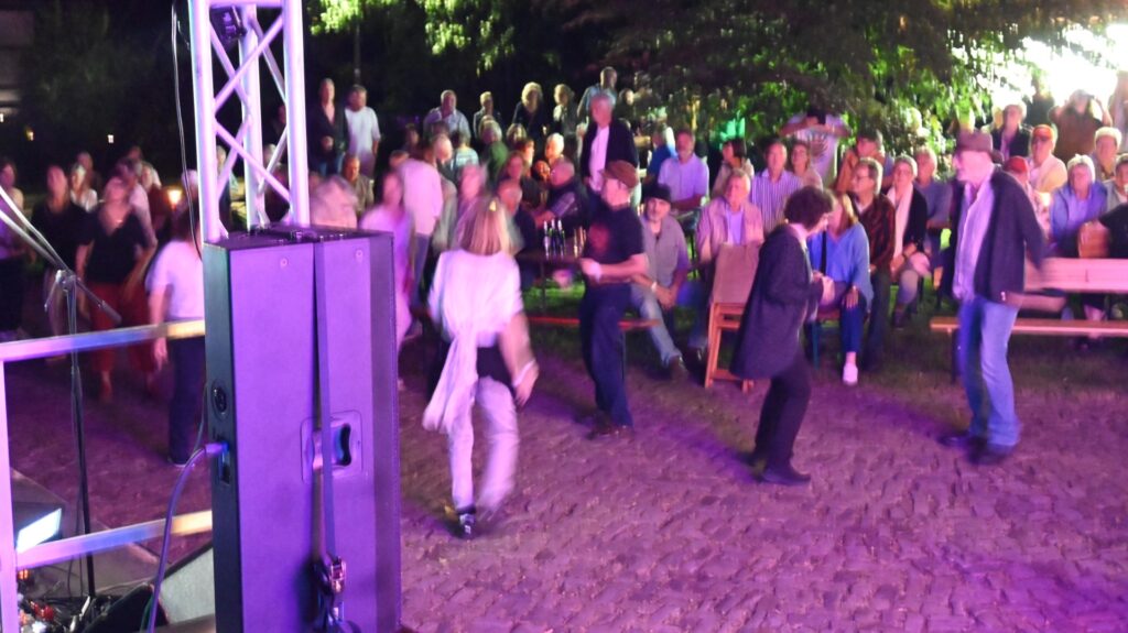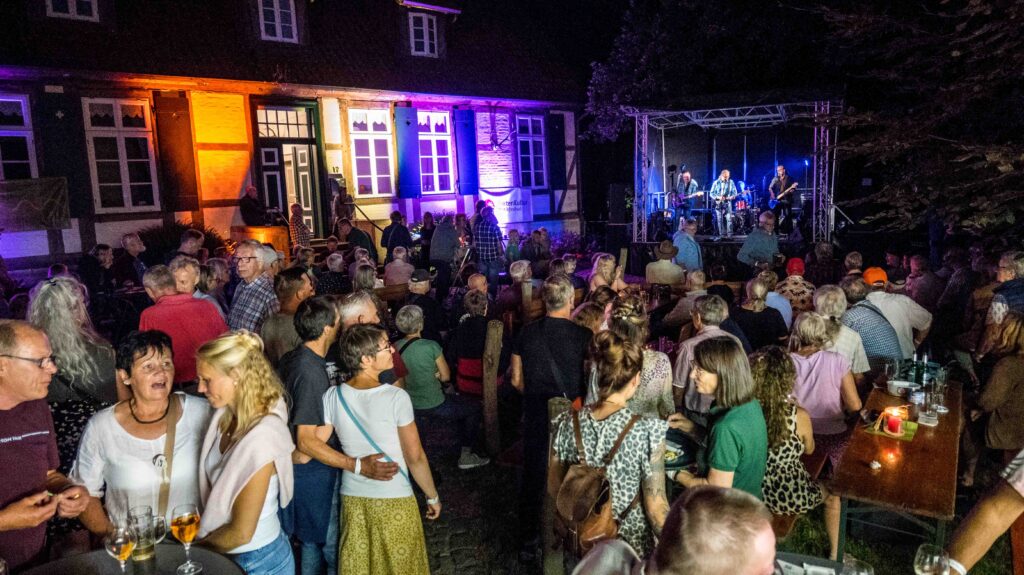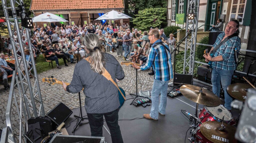 Vor dem wunderschönen Fachwerk-Ensemble der Alten Oberförsterei kam innerhalb kürzester Zeit blendende Stimmung auf. Die Band aus Minden heizte bei allerbestem Party-Wetter mit Bass, Gitarren und Schlagzeug ein. Hey Tonight, Bad Moon Rising, Proud Mary, Down on the Corner – ein Ohrwurm jagte den nächsten. Es war Musik, die zum Tanzen animierte: „Normalerweise brauchen die Leute ja immer etwas, bis sie sich vor die Bühne trauen, aber heute wurde schon ab dem dritten Lied getanzt“, so Regina Sprado vom Heimatverein.