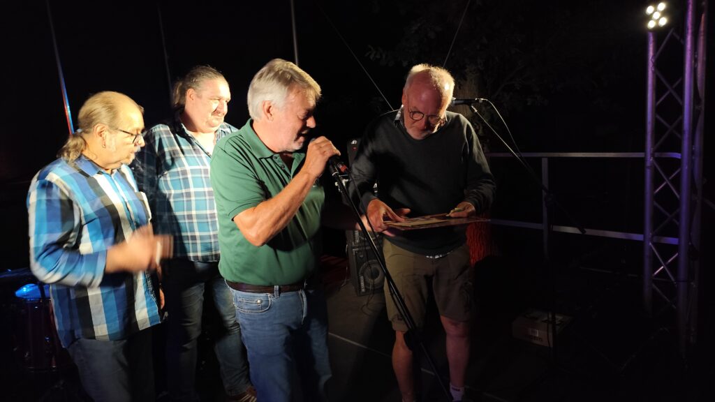 Neben guter Musik gab es an diesem Abend noch eine weitere Freude für den Neubruchhausener Manfred Dose. Aus 300 verkauften Losen hatte er die Nummer 55 gezogen – eine Zahl mit Symbolkraft, schließlich feiert der Heimatverein 2025 seinen 55. Geburtstag. Der Gewinn war die fast schon historisch zu nennende LP „Creedence Clearwater Revival – Live in Germany“ von 1973. „Die hatte ich tatsächlich noch nicht“, freute sich Dose, der rund 150 Schallplatten besitzt. Aufgelegt wird das gute Stück künftig stilecht auf seinem 60 Jahre alten Audio Linear Plattenspieler: „So etwas gibt es heute gar nicht mehr.“ Im Paket waren außerdem eine CD der CCR Revival Band und ein Gutschein für eine Werkbesichtigung bei der Plattenfabrik Pallas in Diepholz enthalten – dort, wo noch heute Vinyl-Schätze für Bands aus aller Welt gepresst werden.